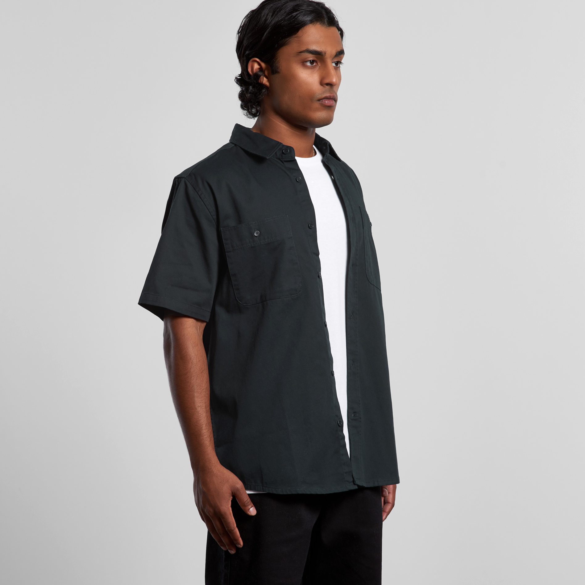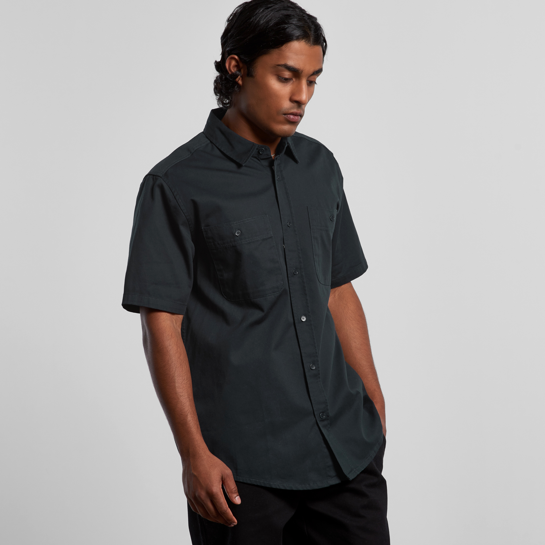 Short sleeve button up shirt, two chest pockets with pen channel, tonal buttons, side seamed, back yoke with hang loop, preshrunk to minimise shrinkage.