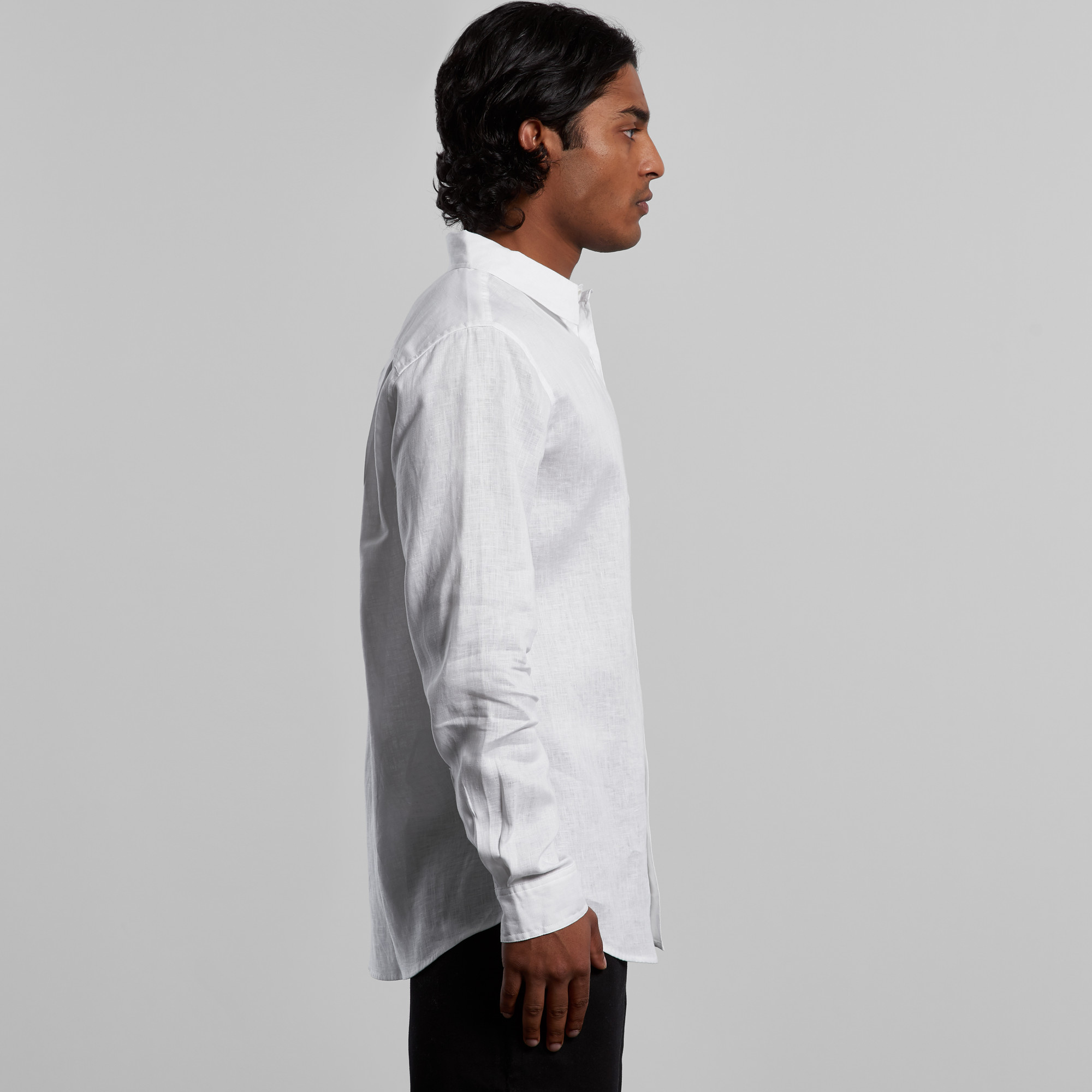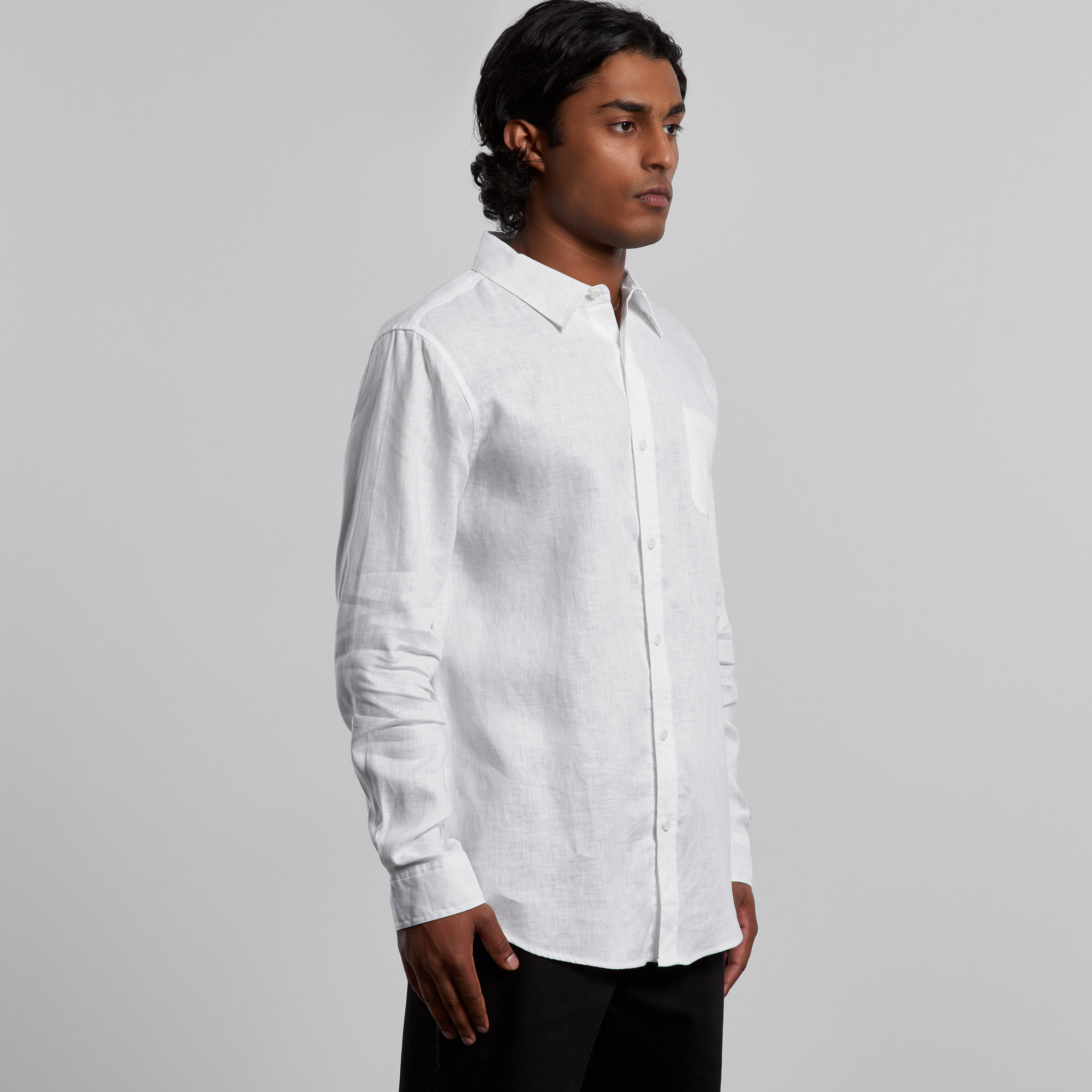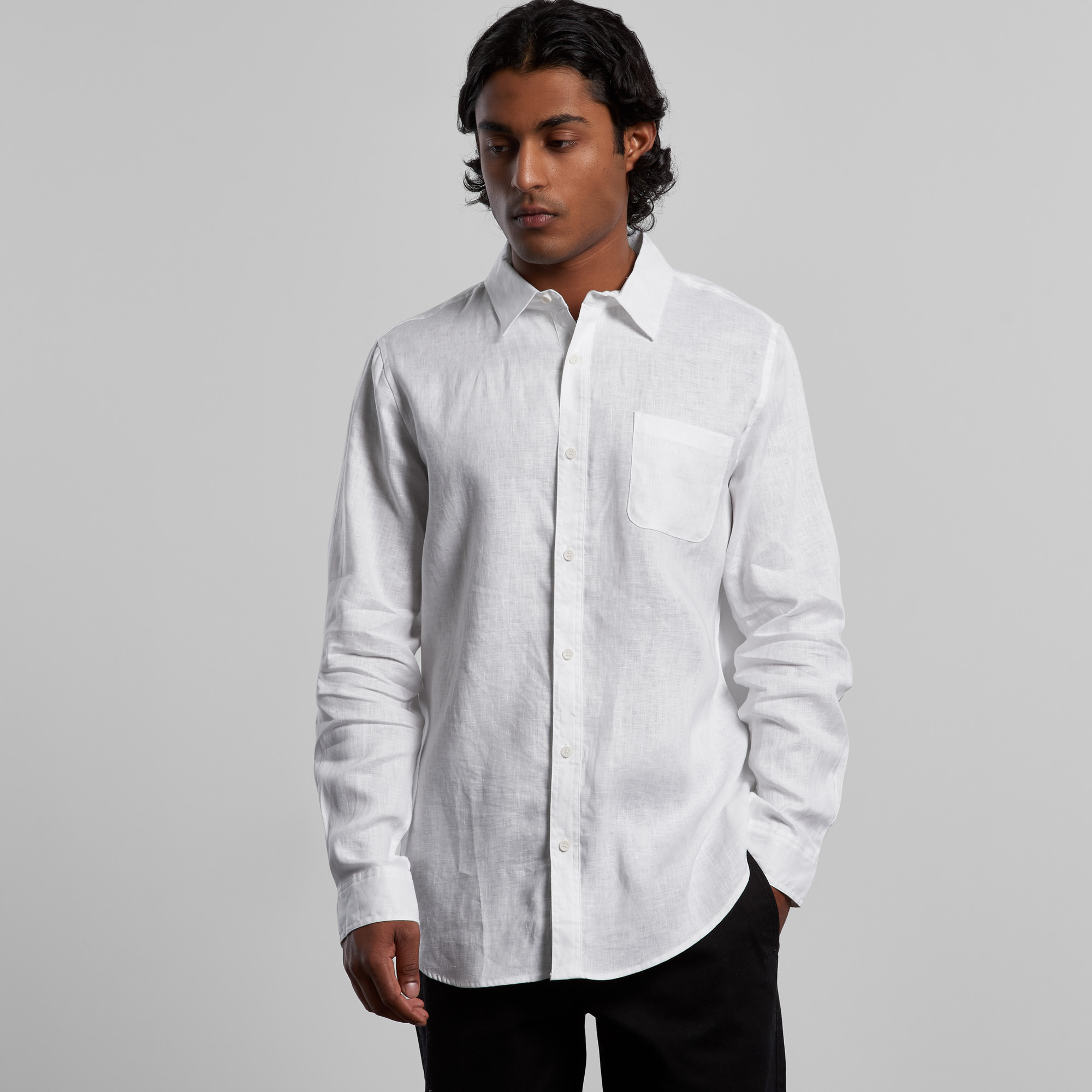 Long sleeve button up shirt, button-down collar, chest pocket, clear buttons, adjustable cuffs