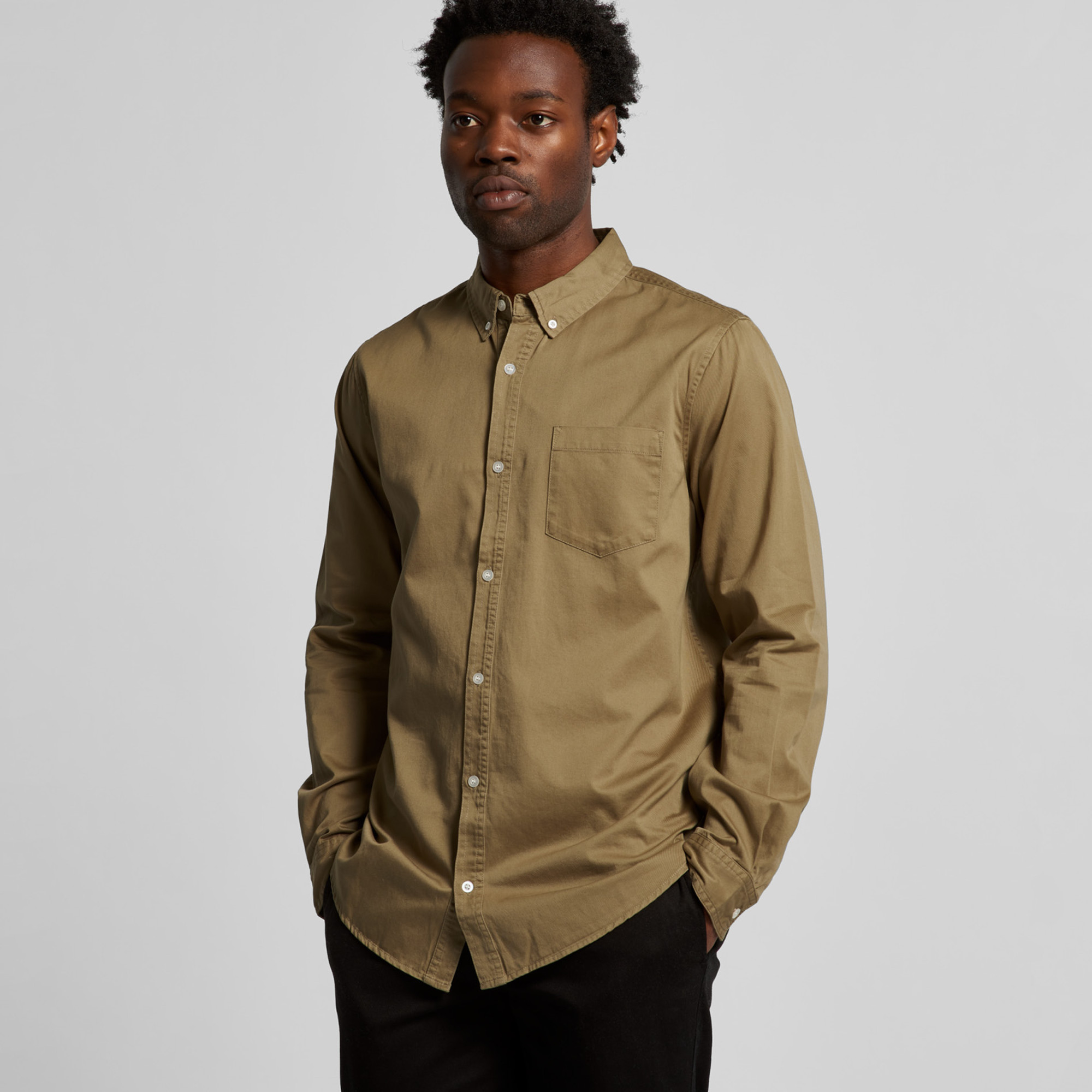 Chest pocket, tonal corozo nut buttons, back yoke, side seamed, preshrunk to minimise shrinkage