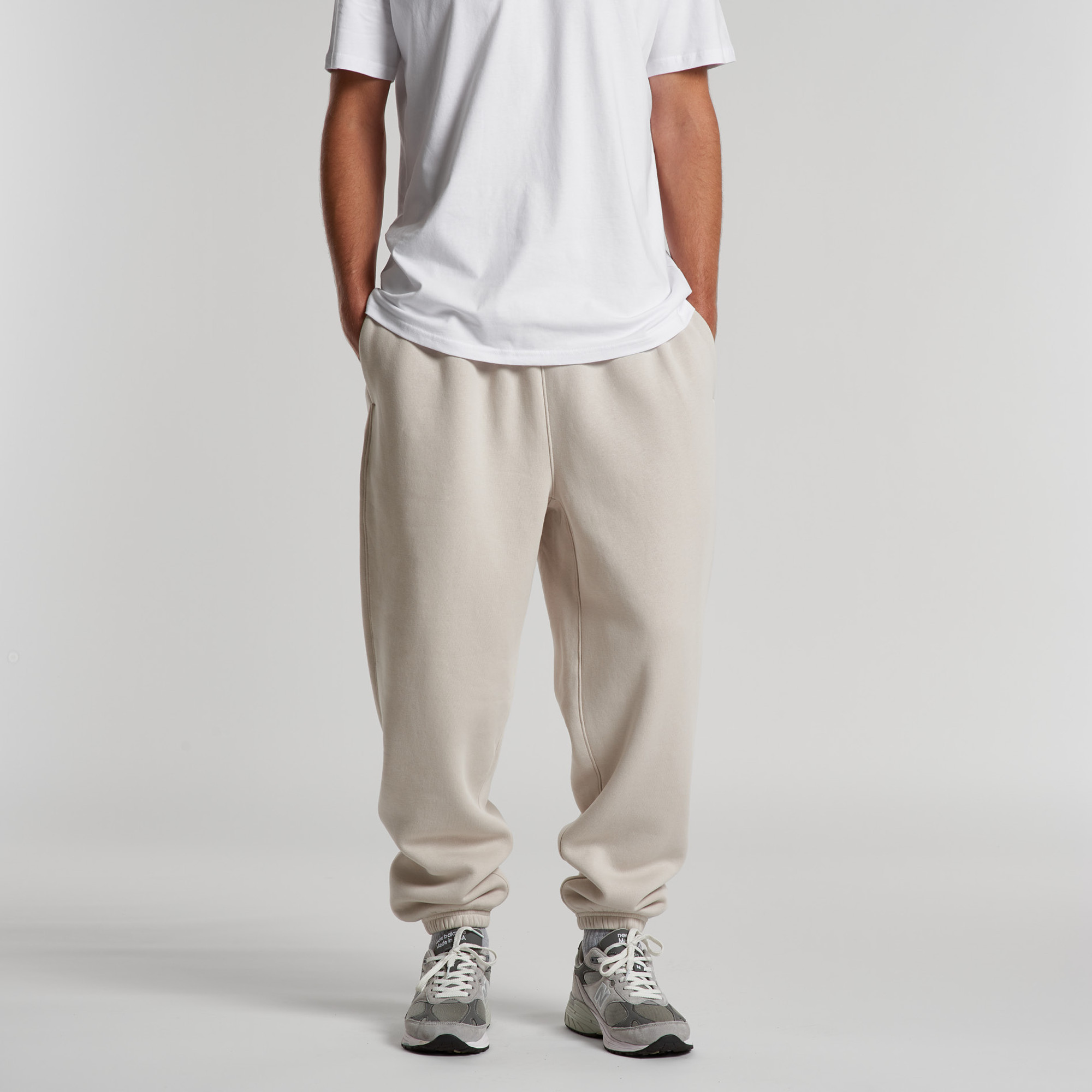 Self-fabric elasticated waistband & hem cuffs, 2 side pockets, single pocket at back, tonal external drawcord, preshrunk to minimise shrinkage