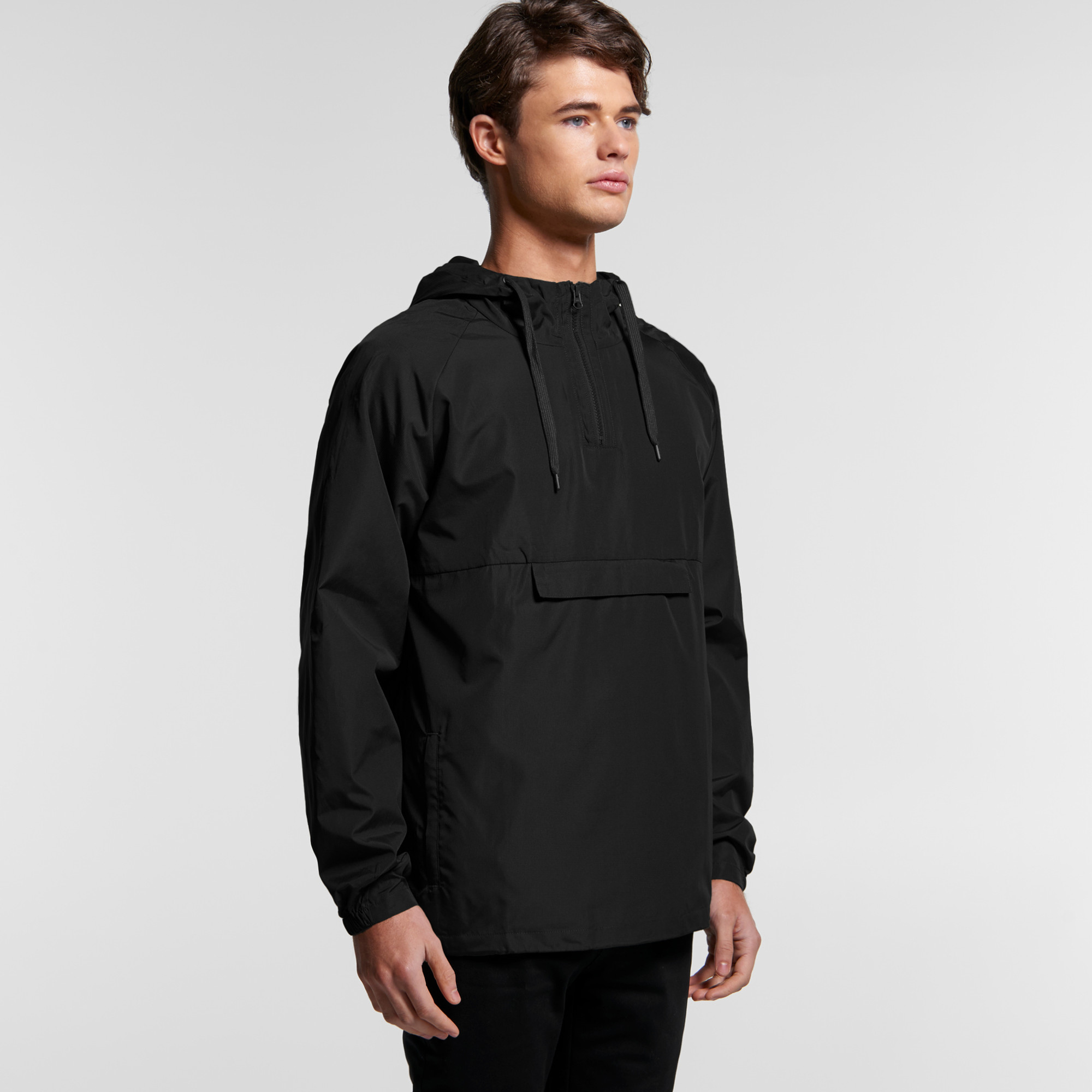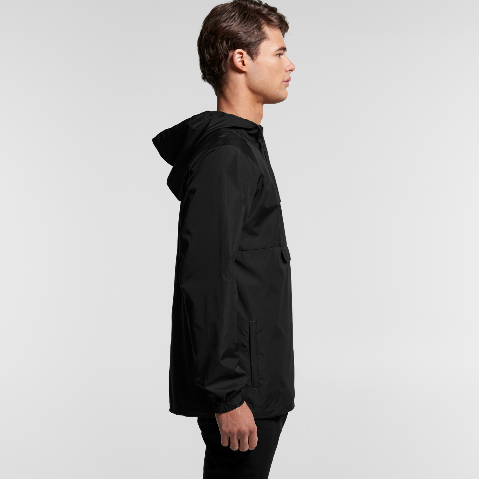 Pullover zip-up hooded windbreaker, rubber headphone patch, adjustable elastic drawcord at hem, 2 side pockets